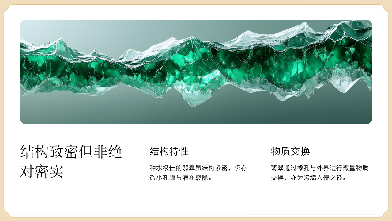 ·结构致密但非绝对密实:即使种水极佳的翡翠,内部仍存在微孔隙或原有绺裂,这些结构是翡翠“呼吸”的通道,也可能成为污垢侵入的路径。
