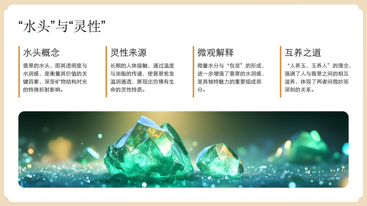 ·“水头”与“灵性”:翡翠的“水头”源于其矿物结构对光的折射及内部微量水分。长期佩戴与盘玩形成的“包浆”,能使其更加温润通透,体现“人养玉,玉养人”的互动关系。