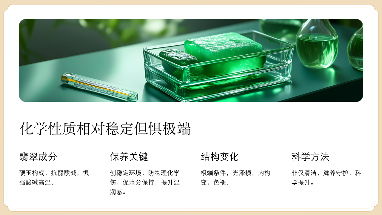 ·化学性质稳定但惧极端:主要成分为硬玉,耐一般弱酸弱碱,但强酸、强碱、高温、暴晒等极端环境会损害其光泽与结构,甚至导致颜色褪变。