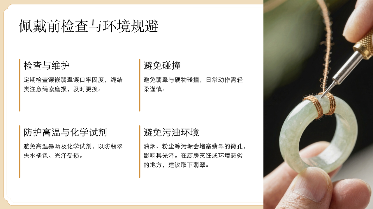 ·避免碰撞:远离剧烈运动、体力劳动,注意在开关车门、做家务时保护翡翠。